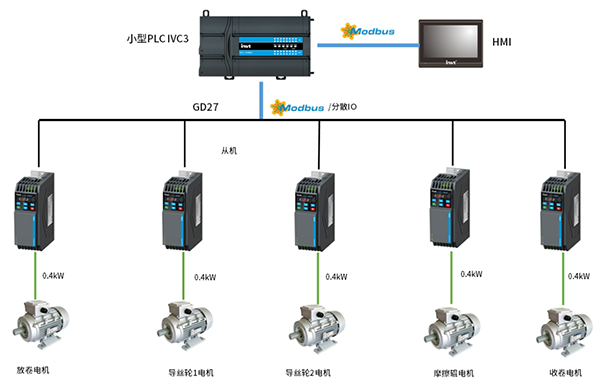 Afin de répondre aux exigences du client, INVT a proposé d'adopter le nouveau convertisseur de fréquence de la série GD27 pour la transformation et la mise à niveau du système. Ce convertisseur de fréquence contrôle la sortie de fréquence par le biais de la communication RS485, ce qui permet de réaliser la réponse rapide et synchrone de 30 convertisseurs de fréquence dans un seul équipement. Comparé à la méthode traditionnelle de transmission mécanique, le convertisseur de fréquence d'INVT peut réduire efficacement la casse du fil et augmenter la productivité.