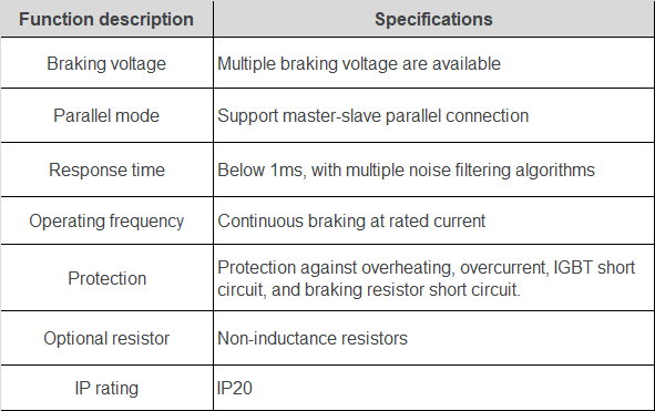 DBU100H dynamic braking units are mainly used in lifting equipment, equipment with high inertia, and some scenarios where crash deceleration, positioning and braking are needed, such as mine hoists, elevators, textile machinery, paper-making machinery, centrifuges, washing machines and overhead cranes.